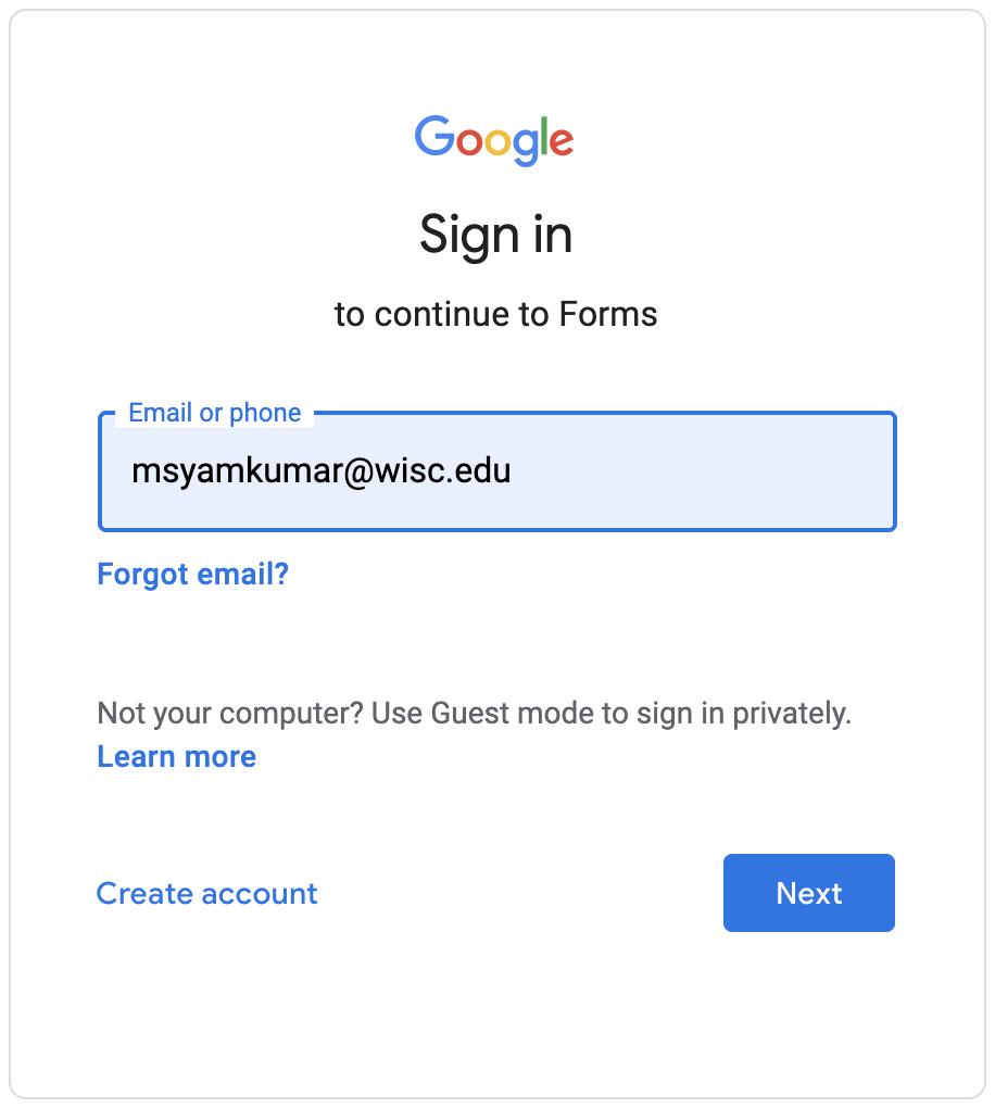 For forms requiring authentication, make sure you sign in with your @wisc.edu, like this: